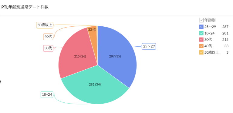 20代の方が人気があり、デートできるのは20代の方のほうが有利なようにもみえますが、ただ、そもそも20代の方は会員数も多いので、必然的にデートされた方も多かった可能性もあります。…(略)…サポーターとなる男性様の年齢が40代、50代、60代が多いので、30代40代の女性と知り合いたい人がいたときに、ライバルが少ないことはチャンスと言えそうです。