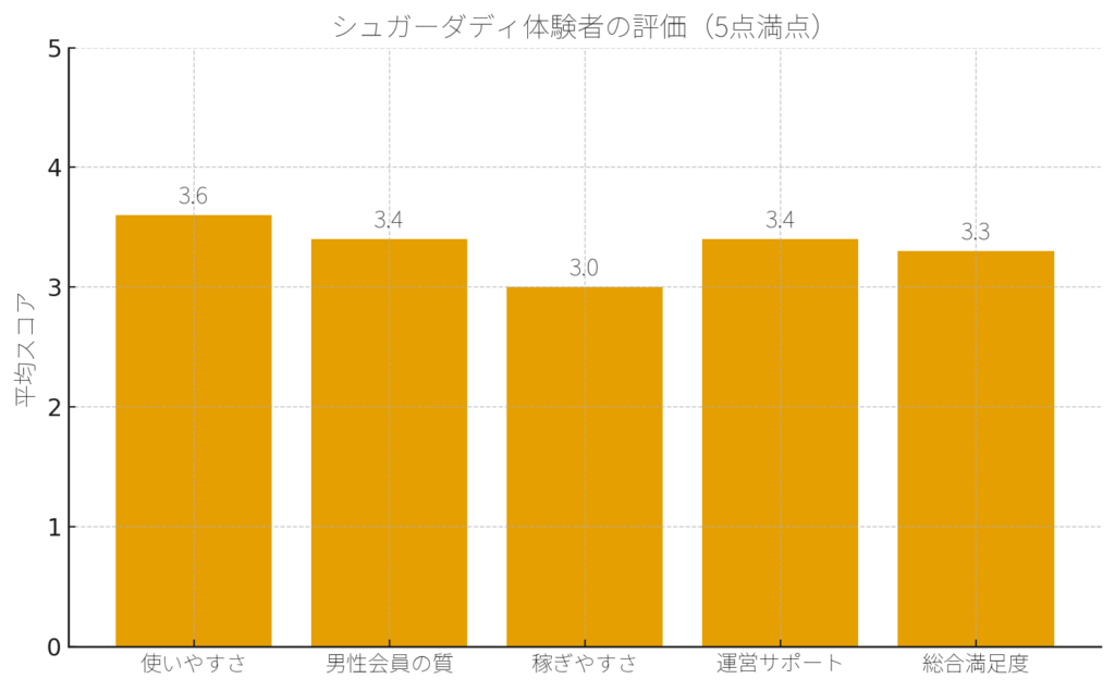 「使いやすさ」「男性会員の質」「稼ぎやすさ」「運営対応」「総合満足度」を分析しました。